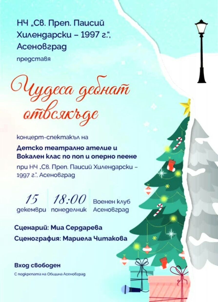 Концерт-спектакълът на Детско театрално ателие и Вокален клас по поп и оперно пеене към читалището ще започне в 18:00 ч., а мястото е Военен клуб - Асеновград.