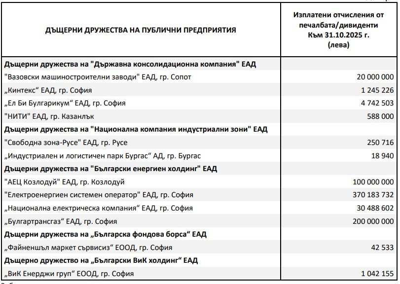 96% от общия размер на постъпилите дивиденти или 1.57 млрд. лв. са внесени от „Българския енергиен холдинг“. БЕХ е внесло в хазната 669.4 млн. лв. от отчетената печалба за 2024 г. и втори път 900.1 млн. лв. на база 100% от отчетената печалба за първото полугодие на 2025 г. Втората вноска се явява авансова и е равносилна на очаквани по-ниски отчисления през настоящата 2026 г.