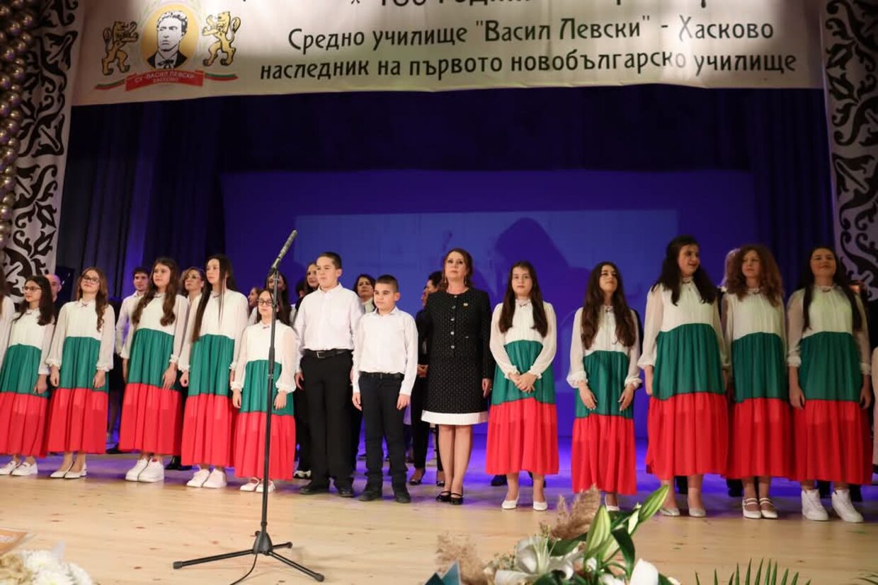 За първи път в 180-годишната си история СУ „Васил Левски“ има свой химн. Той беше изпълнен за първи път тази вечер на сцената на ОНЧ „Заря-1858“. Учениците и преподавателите на училището, с подкрепата на екипа на ДКТ „Иван Димов“, подариха на своите гости впечатляващ спектакъл, проследяващ историята на първото новобългарско училище в Хасково от далечната 1846 година до днес.