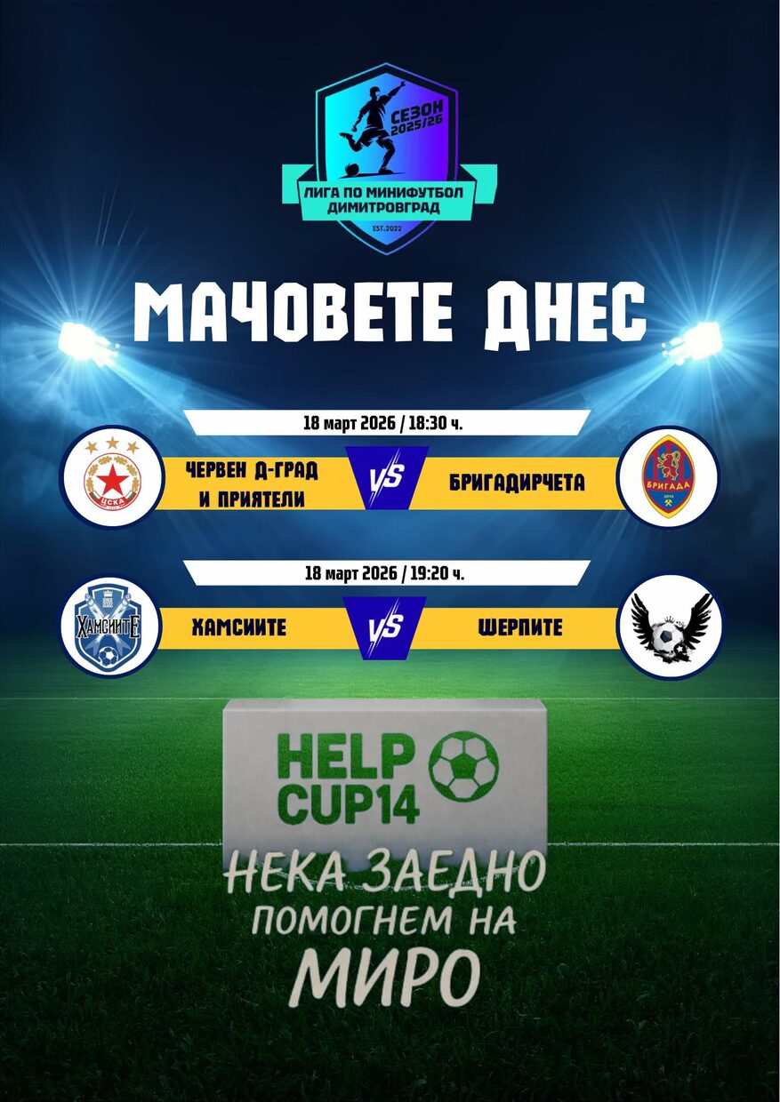 От 16 до 18 март се провеждат мачове от Лига по минифутбол в Димитровград.Това е 14-ото издание на HELP CUP, традиционна благотворителна инициатива, превърнала се в символ на съпричастност, добрина и единство в спортната общност на града.
