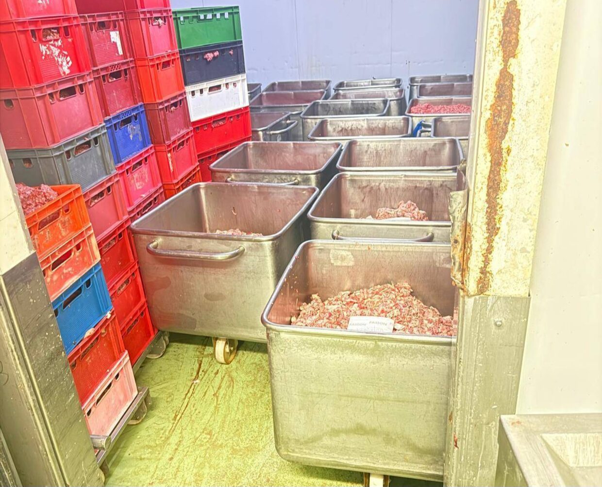В друг склад са установени над 3 тона осолена сланина, за които не може да се докаже спазване на технологичния процес на обработка, както и 1 тон осолено месо, съхранявано в дървени съдове, които не позволяват ефективно почистване и дезинфекция.
