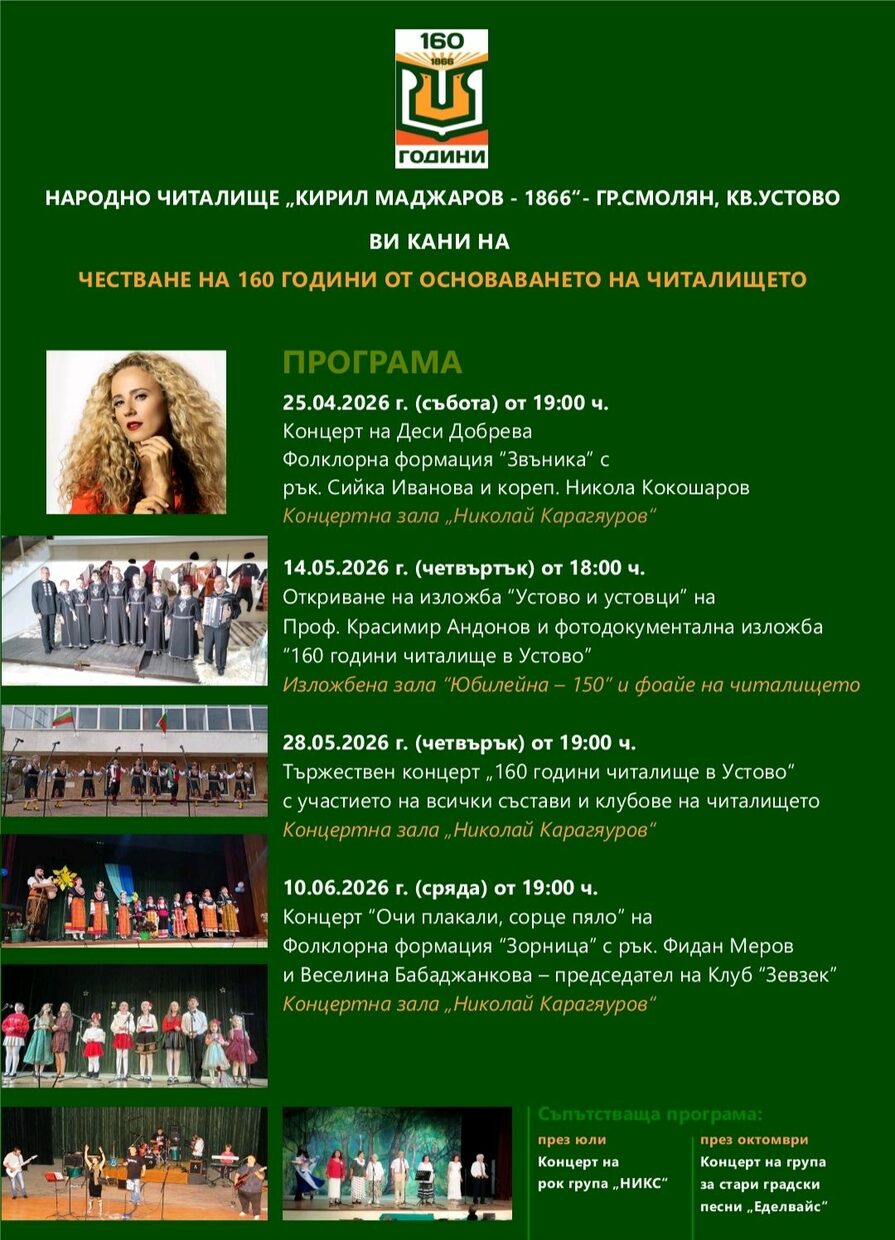 С поредица от културни прояви Народно читалище „Кирил Маджаров – 1866“ в квартал Устово, Смолян, ще отбележи 160 години от своето създаване. Инициативата преминава под мотото „160 години будим духа, 160 години създаваме бъдеще!“ и ще събере жители и гости на града в празнична атмосфера.