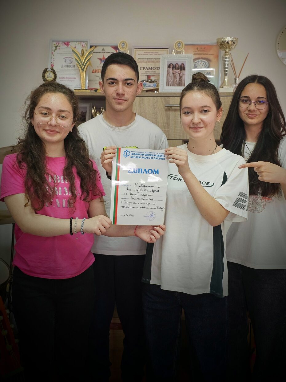 Трио „Хармоника“ и Арда Джебеджи, с ръководител Дамла Йорданова, бяха отличени с диплом за отлично представяне във финалния етап на Националния конкурс за изпълнители на забавна песен – Пловдив 2026.