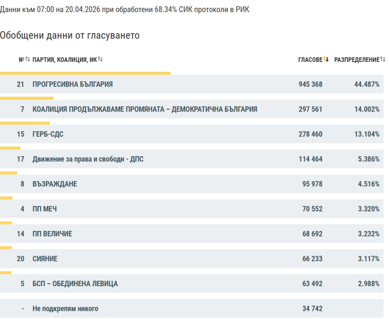 Официалните данни на Централната избирателна комисия към 07:00 часа на 20 април 2026 година, при обработени 68,34% от секционните протоколи в районните избирателни комисии, показват убедителна преднина за „Прогресивна България“.