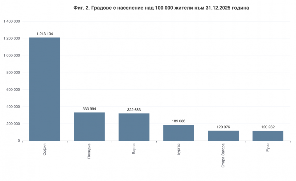 Към 31 декември 2025 г. населението на България е 6 423 207 души. В сравнение с 2024 г. населението на страната намалява с 14 153 души, или с 0.22%. Мъжете са 3 088 245 (48.1%), а жените - 3 334 962 (51.9%), или на 1 000 мъже се падат 1 080 жени. Броят на мъжете преобладава във възрастите до 55 години включително. С нарастването на възрастта се увеличават броят и относителният дял на жените от общото население на страната, съобщи Националният статистически институт.