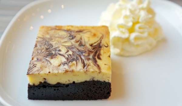 Загрейте фурната на 180 градуса. Във правоъгълна форма за печене сложете намазнена хартия за печене. Разделете яйцата на жълтъци и белтъци. Разбийте жълтъците с пудрата захар. Разтопете шоколада на в...