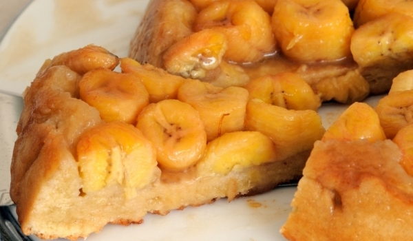 Петдесет грама масло се разтопяват на бавен огън и се изливат на дъното на тава. Отгоре се изсипва кафявата захар. Бананите се режат на кръгчета и се слагат на дъното на тавата. Брашното се смесва съ...