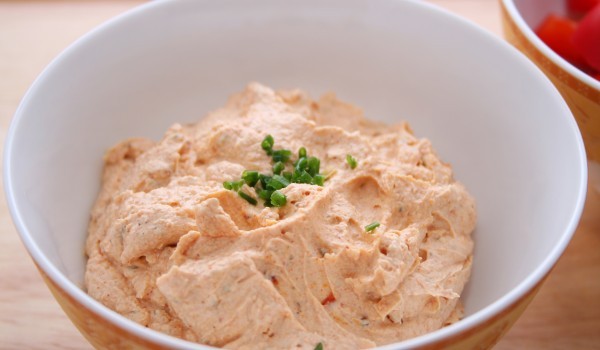 Разбийте със солта цеденото кисело мляко в дълбока купа. Натрошете сиренето в съд за блендер или пасатор, добавете изварата, олиото и киселото мляко. Пасирайте до хомогенна смес. Смесете на няколко п...