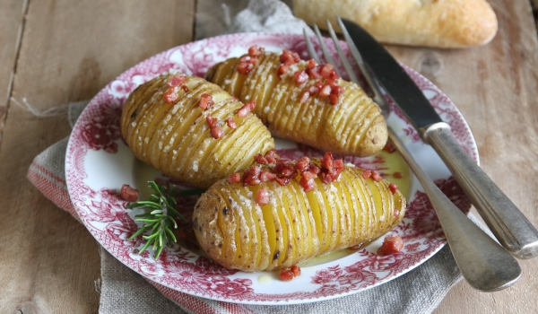 Намазнете тавичка за печене. Направете успоредни разрези на обелените и измити картофи, но не до долу, така че да може да се запази дъното на картофа. Нарежете ивиците бекон и ги сложете в разрезите....