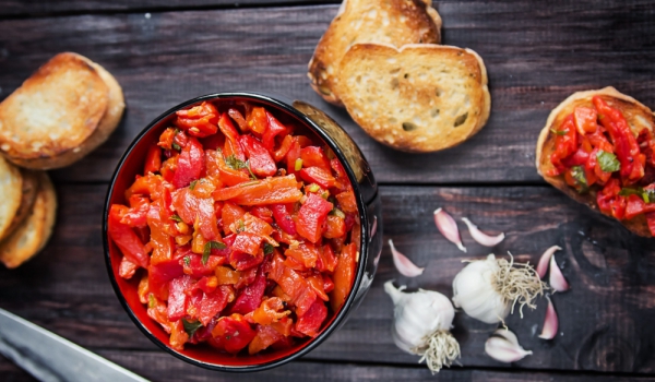 Опечете чушките, задушете ги за кратко и ги обелете. Почистете ги от семките и ги нарежете на ленти. В дълбока купа сложете печените чушки, покрийте ги с наситнения пресен чесън и босилек. Залейте ги...