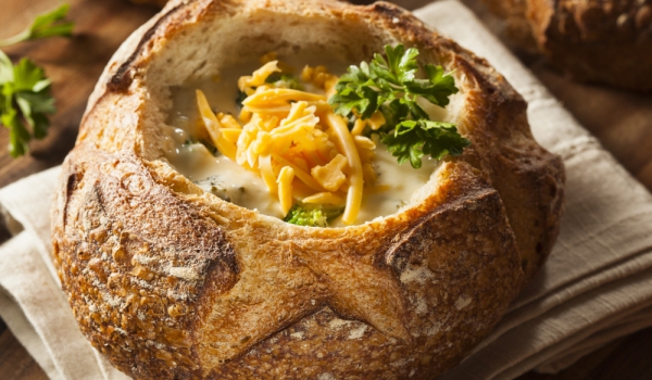 Срязват се капачетата на питките и се вади вътрешността. Маслото се разтопява на бавен огън и се добавя брашното. Разбърква се и се добавя бульонът, солта и черният пипер. Добавят се крема сиренето и...