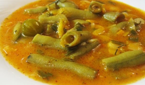 Празът и резенето се запържва в половината от зехтина. Добавят се всички зеленчуци около 10 мин. Добавя се бобът и водата и се осолява и поръсва с черния пипер. Поръсен със зехтин хляб се слага в к...