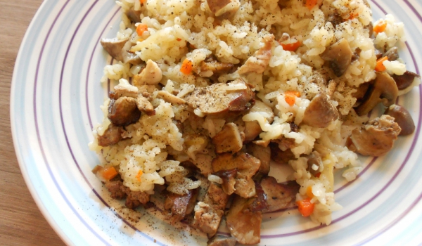 Поставете почистения и изплакнат ориз в сгорещено масло, посолете, залейте с 450 мл вода и задушавайте до омекване, без да разбърквате. Изпържете ситно нарязания лук и морков в малко олио, прибавете...