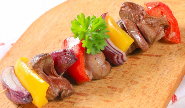 Почистените дробчета се нарязват на парченца. Овкусяват се със сол и черен пипер. Всяко дробче се увива в лентичка бекон и се нанизват на шишчета. Поставете шишчетата върху сгорещена скара и ги запеч...
