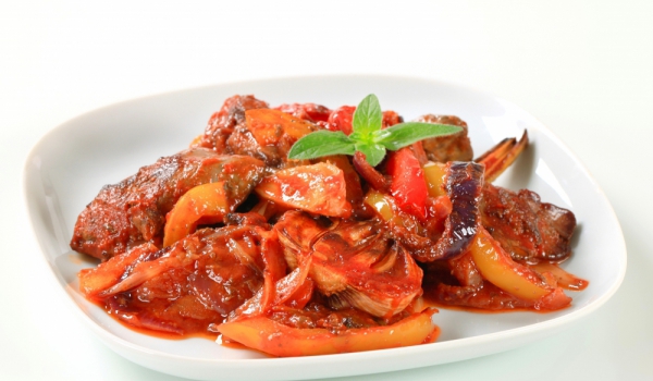 Запържват се лукът и морковът, които са предварително нарязани, в малко олио. След това се добавят дробчетата, които са нарязани. Като се запържи добре се добавят и чушките, след като всичко се запър...