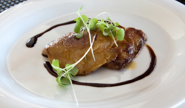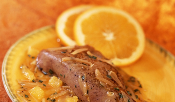 Загрейте по-голямата част от маслото в дълбок тиган и запържете нарязания дроб. Махнете го от тиган и го запазете топъл. Почистете тигана от оставащата мазнина и сипете сока от два портокала. Малко с...