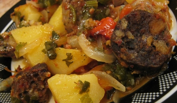 Кървавицата и морковът се нарязват на колелца, лука и чушките на ивици, картофите - на едри кубчета. Всичко се слага в гювеч, който е намаслен предварително. Добавят се и доматите, нарязаните подправ...