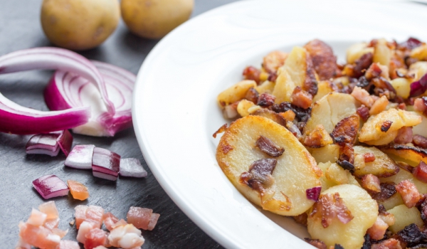 Запържете леко в мазнината нарязаните бекон и лук. Обелете картофите, измийте ги и ги нарежете на тънки филийки. Изсипете ги при бекона, притиснете с лъжица, захлупете с капак и ги оставете да се пър...