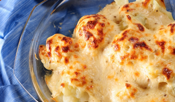 Разделете карфиола на розички и ги сварете в подсолена вода с малко масло. Прецедете и в подходяща тава наредете ред карфиол, ред нарязана на ситно шунка, поръсете с настърган кашкавал. Най-горният п...