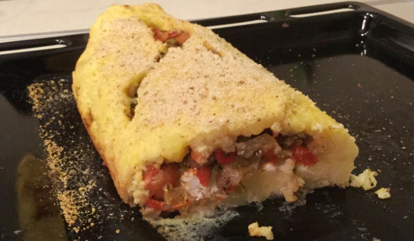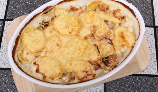 Картофите се сваряват и нарязват на кръгове, след което се посоляват. Нарежете лука и чушките, задушете ги заедно с бекона в олиото. Махнете от огъня и подправете с кима. Разбийте сметаната, прибавет...