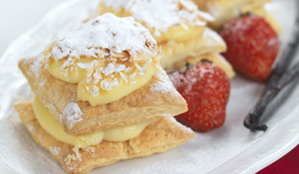 Бутер тестото се разточва на две кори с дебелина 3 милиметра. Слагат се в тава, напръскана с вода, пробождат се с вилица на няколко места и се пекат 10-15 минути на 200 градуса. Прави се крем, като ж...
