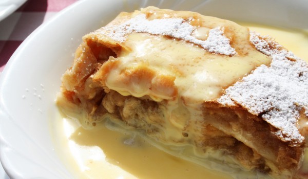 Накиснете стафидите в рома поне за 1 час. Загрейте прясното мляко до кипване, прибавете захарта и бъркайте докато се разтвори. Отделно разбийте яйцата със захарта и брашното и започнете да прибавяте т...