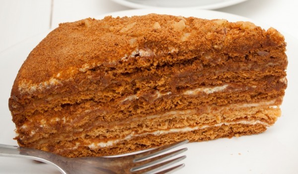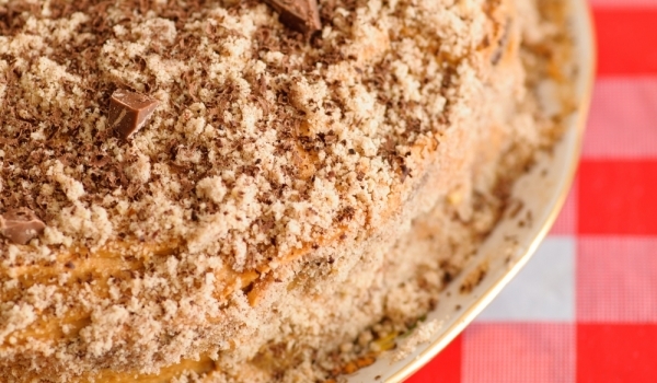 Разбийте сладкарската сметана с 1-2 с.л. боровинков сок, колкото да придобие лек виолетов отенък. Затоплете водата и разтворете в нея меда. С този меден сироп полейте леко първия блат, който сте поста...
