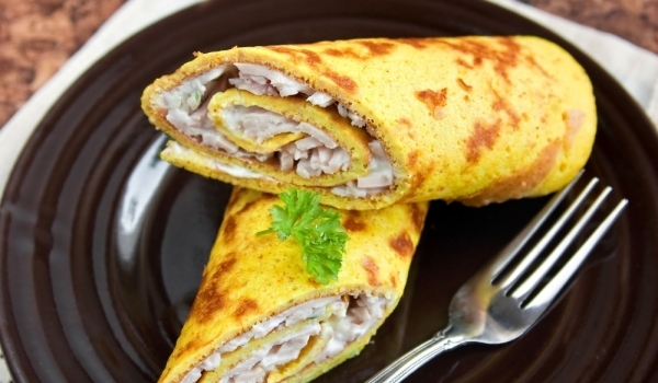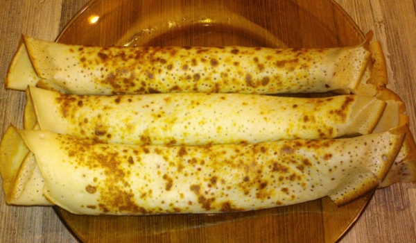 Яйцата се разбиват в средно голяма купа. Поръсват се със сол. Добавя се брашното и прясното мляко, за да се получи гладко палачинково тесто. Загрява се маслото или олиото в малък тиган с висока темпе...