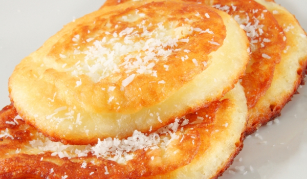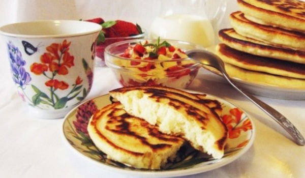 Разбъркайте брашното с газираната вода, захарта, ванилията, бакпулвера и солта. Разбийте с миксер до получаване на рядка каша. Добавете 1 с.л. олио и разбийте още малко. В тиган с незалепващо покрити...