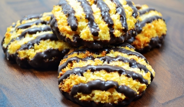 Разбийте белтъците със солта и след като се постегнат, започнете да добавяте постепенно захарта. Разбивайте, докато се получат твърди върхове. Отделно объркайте кокосовите стърготини с брашното и доб...