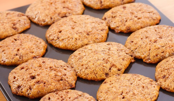 Маслото се разбива със захарта. Добавят се яйцата и ванилията. В отделен съд се смесват брашното, солта, содата и бакпулвера. Добавя се към течната смес. Прибавят се овесените ядки и шоколада, наря...