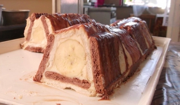 Бисквитите се напояват леко с прясно мляко/вода. Нареждат се шахматно върху парче алуминиево фолио или прозрачно. Редят се на 4 реда по 3 бисквити. От крема сиренето, маслото и захарта се забърква кр...
