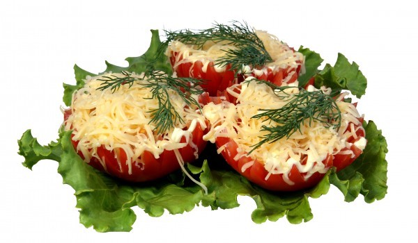 Изрязват се капачета на доматите и се издълбава вътрешността. Издълбаните домати се отцеждат, а след това се нареждат в намазана с масло тавичка и се посоляват. Във всеки домат се слага бучица масло...