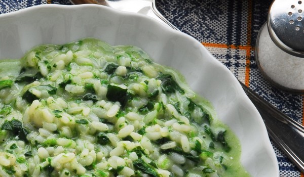 Почистете спанака, нарежете го и го сложете в маслото да се задушава до омекване. Прибавете ориза, веднага след което и водата, около 3 чаши (включително бульона). Оставете, докато оризът уври добре....