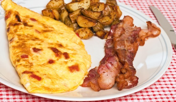 Беконът се нарязва на кубчета и се слага на огъня да се пържи. Прибавя се нарязаният на тънки ивички лук и се задушава до омекване. Посоляват се и се заливат с разбитите яйца. Пържат се, без да се ра...