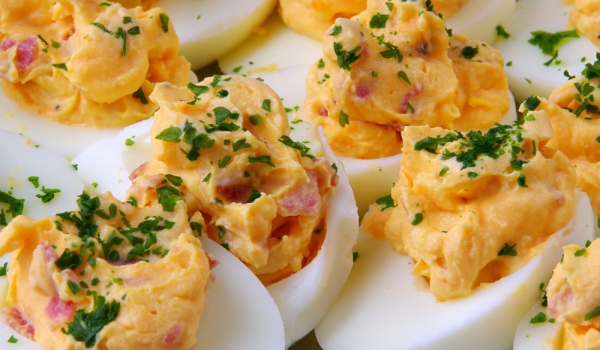 Обелете яйцата и ги разполовете надлъжно. Извадете жълтъците и ги пасирайте. Смелете шунката и я разбъркайте с бешамеловия сос. Прибавете пасираните жълтъци, коняка и подправете с черен пипер и сол....