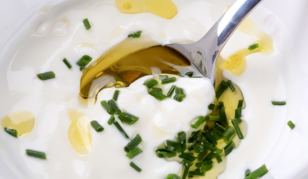 Разбъркайте киселото мляко със зехтина, майонезата и прибавете натрошените яйца, пресования чесън и накълцания копър. Посолете на вкус, разбъркайте и залейте готовите тиквички със соса.