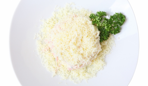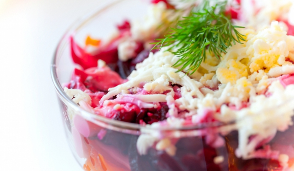 Морковите, картофите и целината се обелват, нарязват се на кубчета и се сваряват в подсолена вода. Отцеждат се и се оставят да изстинат. Добавят се отделно свареното цвеклото, нарязано кубчета, заедн...
