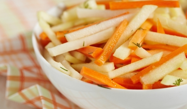 Почистете алабаша, морковите и ябълката и ги настържете на ренде на еднакви пръчици. Сипете ги в купа и ги объркайте. В купичка разбийте последователно меда, горчицата, лимоновия сок със зехтина и п...