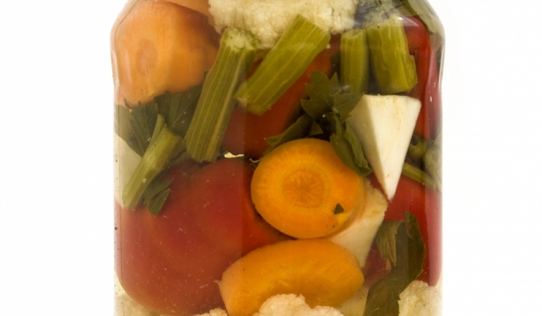 Почистете камбите от семената и ги нарежете на четири. Нарежете морковите на кръгчета, а алабаша на кубчета. Накъсайте карфиола на розички. Целината се реже на ивички, а листата ѝ - на едро. Смесете...