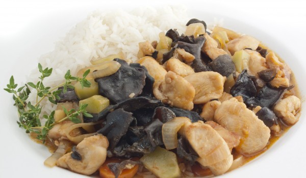 Пилешкото се нарязва на късове и се маринова за час в соев сос и вино. Ако използвате сушени китайски гъби, ги накиснете във вода за половин час. Двата вида гъби се нарязват на парчета след това. На т...
