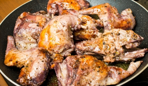 Накиснете предварително гъбите във вода. Нарежете пилешкото на парчета, объркайте го със сол, млян черен пипер и мащерка и оставете да престои. Загрейте маслото на слаб огън и задушете ситно накълцан...