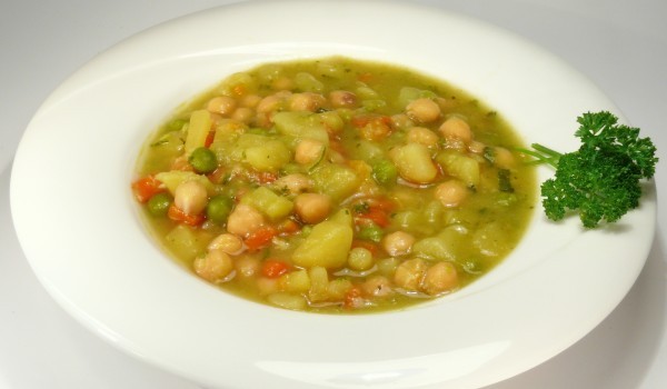Накиснете нахута за една нощ във вода, а на следващия ден го отцедете. Загрейте олиото в тенджера и запържете нарязаните праз и чушки. Щом леко омекнат добавете граха, долейте бульона и прибавете наху...