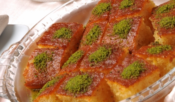 Смесете гриса, захарта и брашното заедно с олиото, ванилията, бакпулвера, портокаловата кора и водата и забъркайте тестото. Покрийте го и го оставете да престои 30 минути. През това време обезкостете...