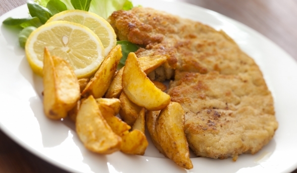 Нарежете месото на шницели. Начукайте ги леко и ги овкусете със сол и черен пипер. Оваляйте ги в брашно и след това в грис. Оставете да отлежата така и след това ги потапяйте в разбити яйца и галета...