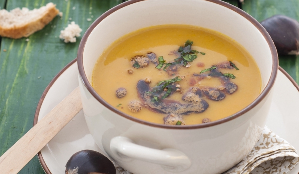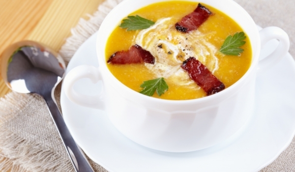 Нарежете тиквата и моркова на кубчета. Задушете нарязания ситно лук в маслото и добавете тиквата, моркова и джинджифила. Долейте бульона и овкусете с подправките и предварително пасирания чесън. Оста...
