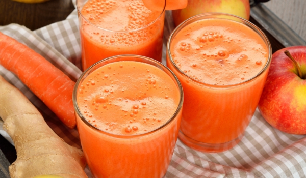 В кухненски робот или блендер смесете сока от моркови, нарязаните домати и лимоновия сок. Разбийте до гладка смес. Добавете нарязания магданоз, джинджифила и леда. Отново разбийте добре и долейте чак...