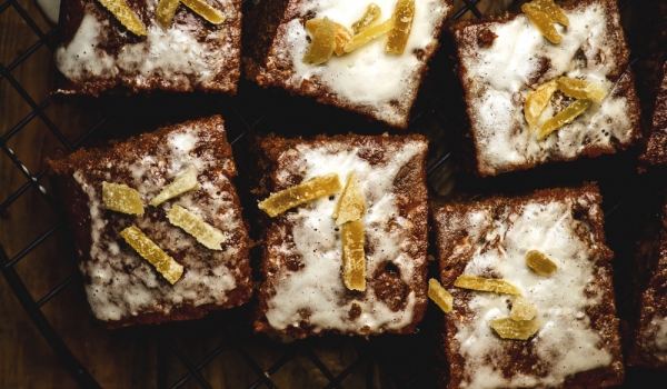 Смесете в купа нарязани и почистени фурми и захаросания джинджифил, нарязан на ситни парченца и ги залейте с врящата вода. Оставете настрана да се поохлади за 10 минути. Загрейте фурната на 180 граду...