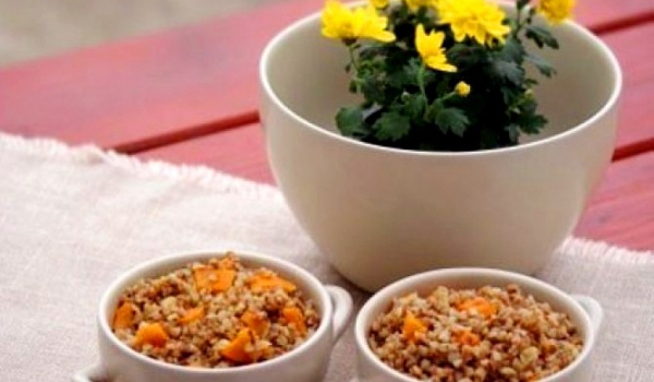 Изпържете добре лука, към него добавете морковите и за 5 минути оставете да се задушат. Сложете след това и гречката, за да запържите и нея за 2-3 минути. Изсипете и водата, подправките и 20 минути...