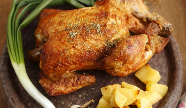 Пилето се почиства, измива и подсушава. От всички останали продукти се приготвя марината. Пилето се маже обилно с нея вътре и вън. Оставя се в хладилник да се овкуси за 1/2 час, като се полива с мари...